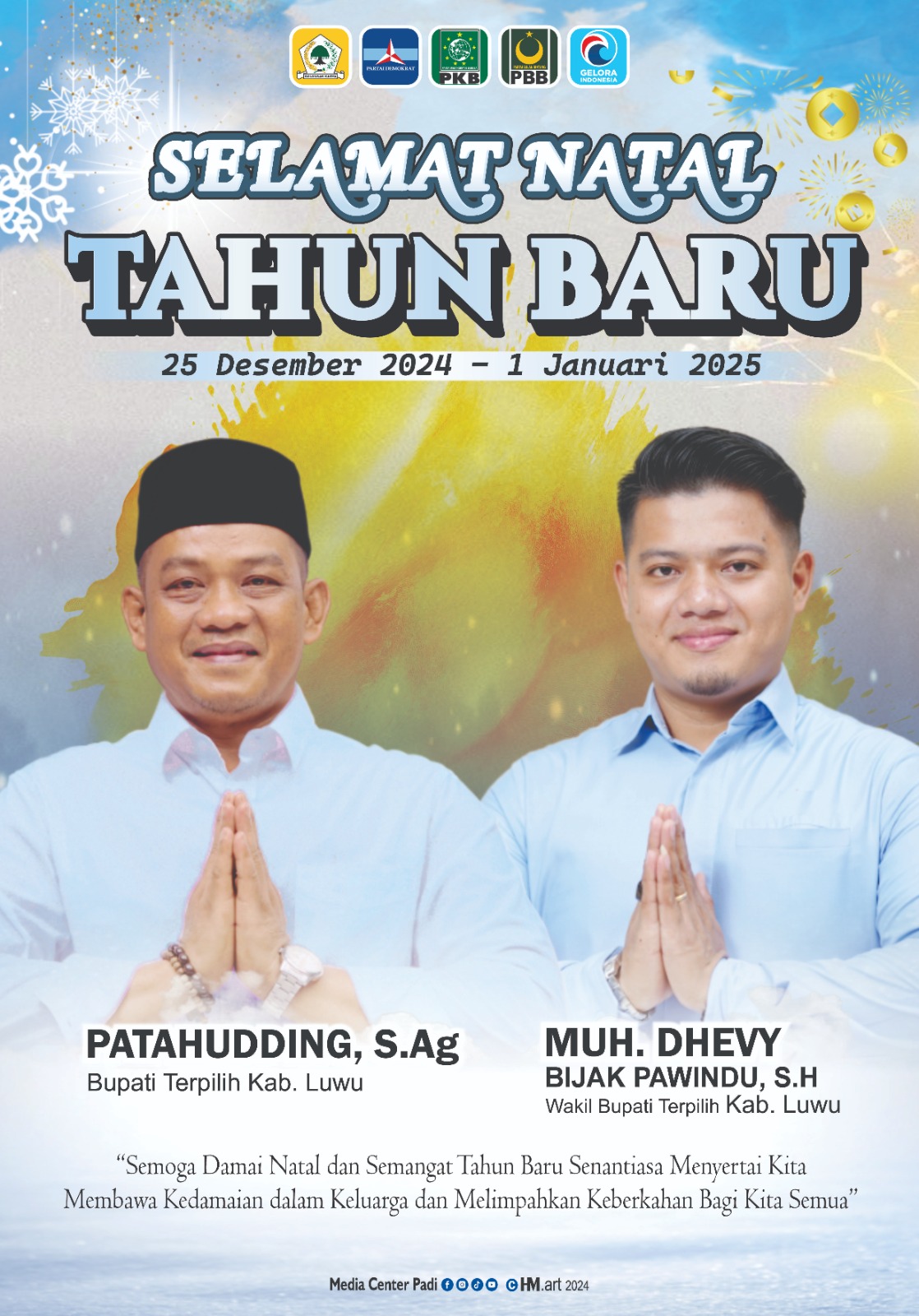 Metroluwuraya.com, Luwu | Luwu, 22 Desember 2024 – Bupati terpilih Kabupaten Luwu, Patahudding, S.Ag., dan Wakil Bupati terpilih, Muh. Dhevy Bijak Pawindu, S.H., menyampaikan ucapan selamat Natal 2024 dan Tahun Baru 2025 kepada seluruh masyarakat Kabupaten Luwu.