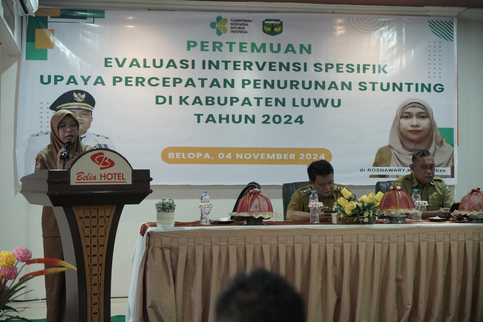 Metroluwuraya.com, Belopa | Penjabat Bupati Luwu, Drs. H. Muh. Saleh, M.Si membuka secara resmi Pertemuan Evaluasi Intervensi Spesifik Upaya Percepatan Penurunan Stunting di Kabupaten Luwu yang dilaksanakan di Aula Hotel Belia Belopa, Senin (04/11/2024).