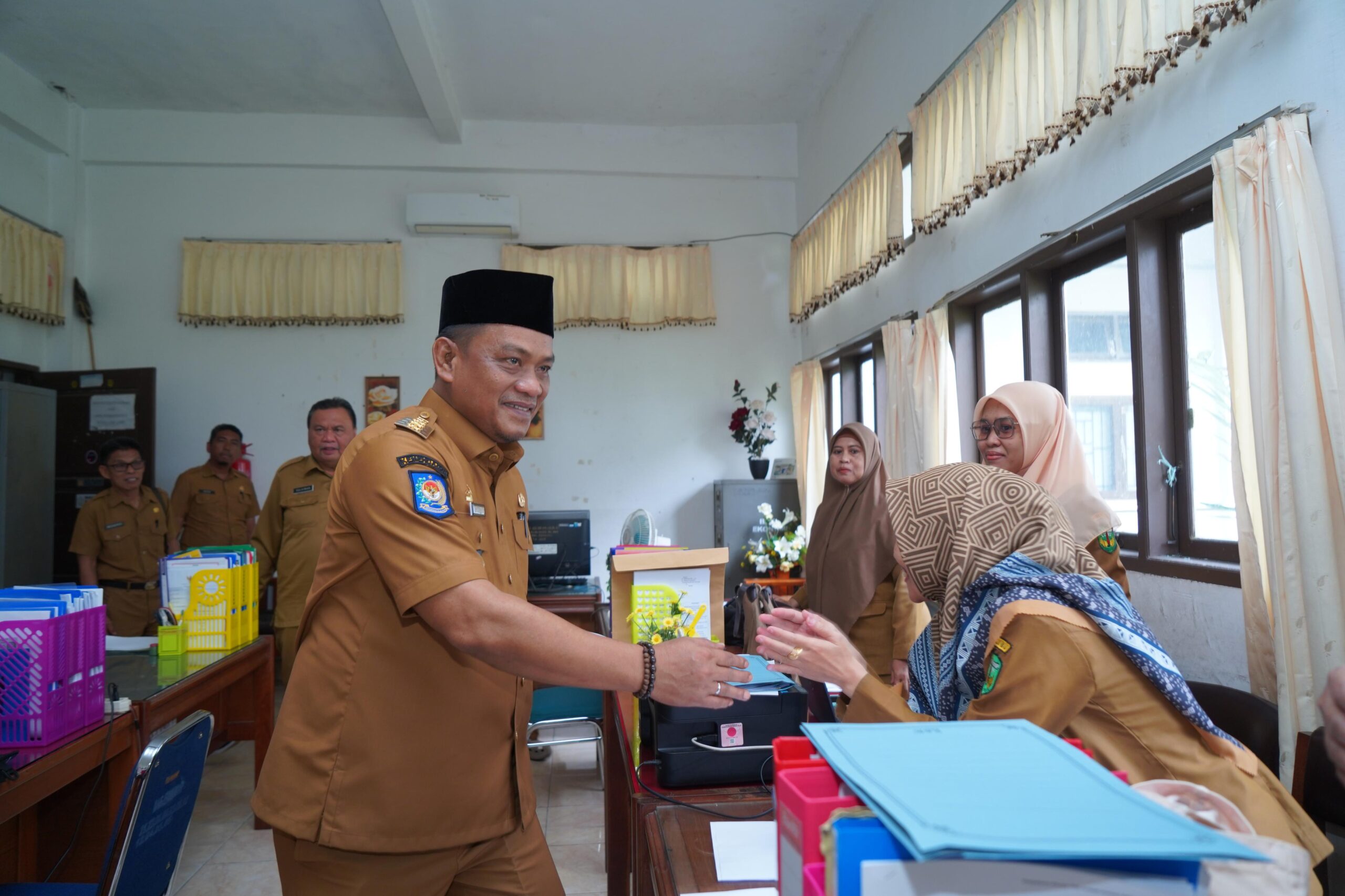 Selain meninjau kehadiran dan aktivitas pegawai, Bupati juga mengamati kondisi fasilitas kerja serta kebersihan lingkungan kantor. Beliau menyapa para pegawai dan menanyakan tugas serta tanggung jawab mereka dalam memberikan pelayanan kepada masyarakat.