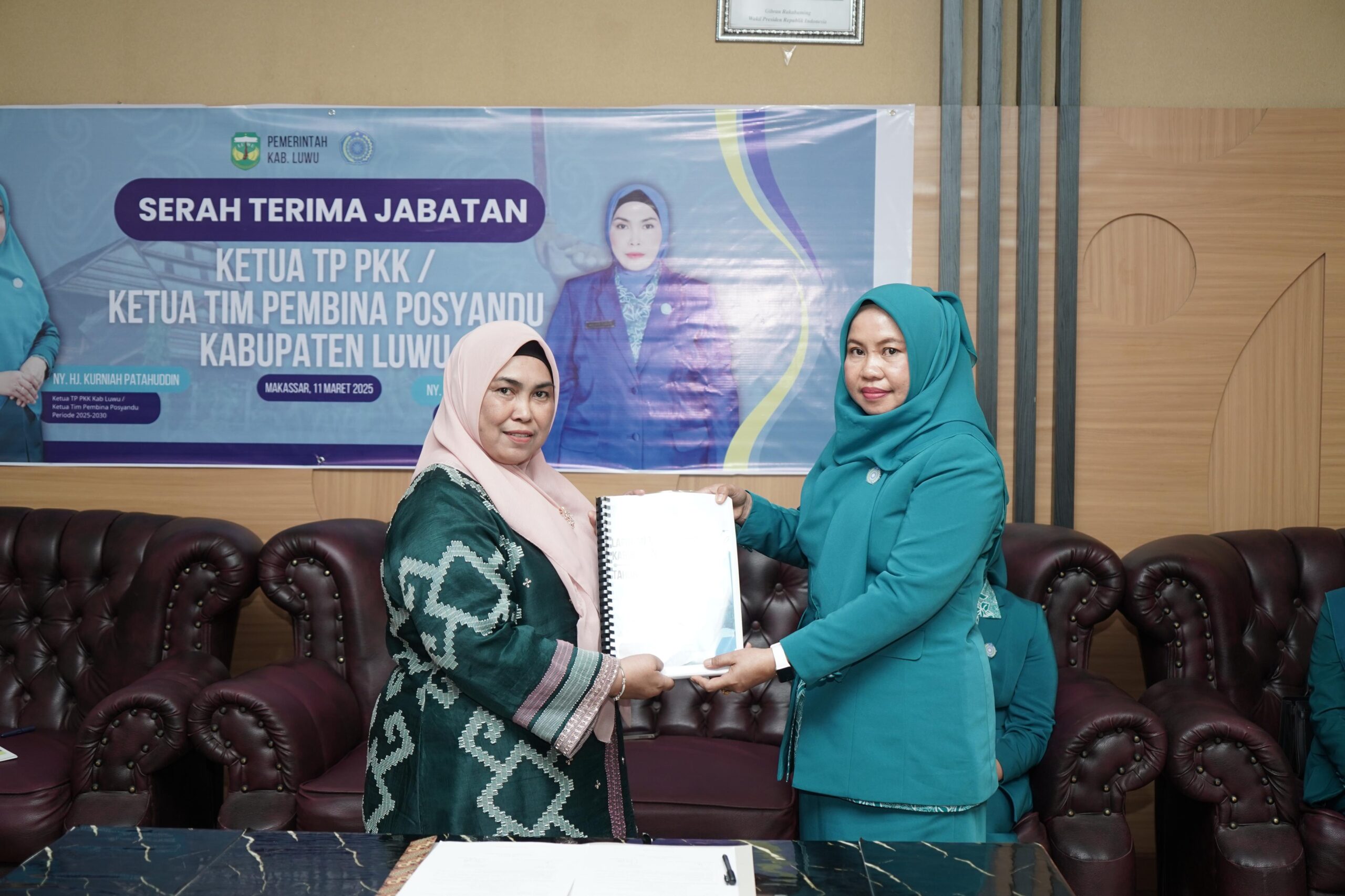 Setelah pelantikan, kegiatan dilanjutkan dengan acara serah terima jabatan dari Ketua Pj. TP PKK Kabupaten Luwu, Hj. Aisyah Saleh kepada Ketua TP PKK Kabupaten Luwu, Hj. Kurniah Patahudding.