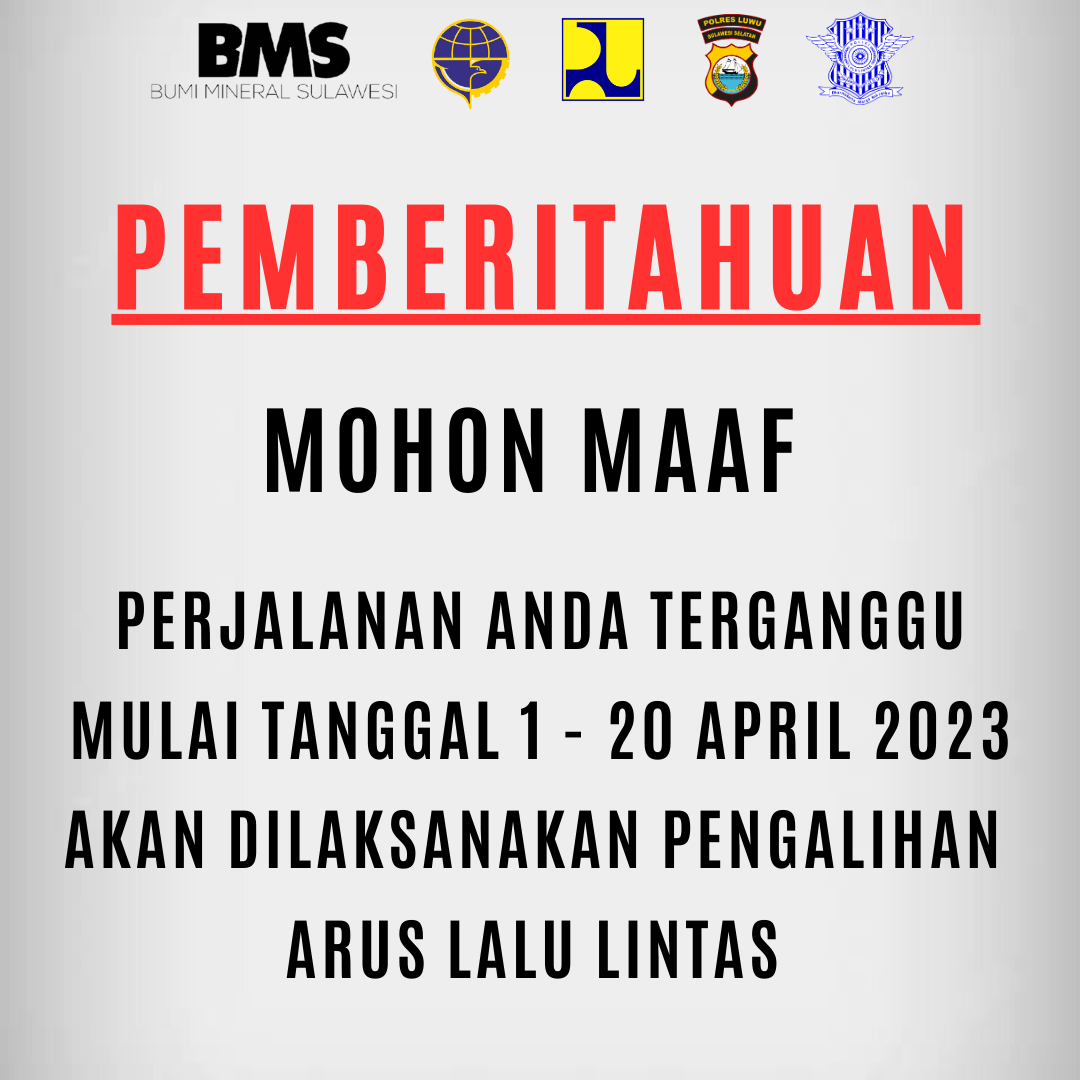 LUWU, METROLUWURAYA.COM — Perseroan Terbatas (PT) Bumi Mineral Sulawesi (BMS) megucapakan permohonan Maaf Kepada seluruh pengendara yang melintas di jalan Tras Sulawsi tepatnya di Desa Toddopuli Kecamatan Bua. Pasalnya, Mulai Sabtu Tanggal 1 Hingga 20 April Pihak PT BMS melakukan Pengalihan Arus Lalu-lintas
