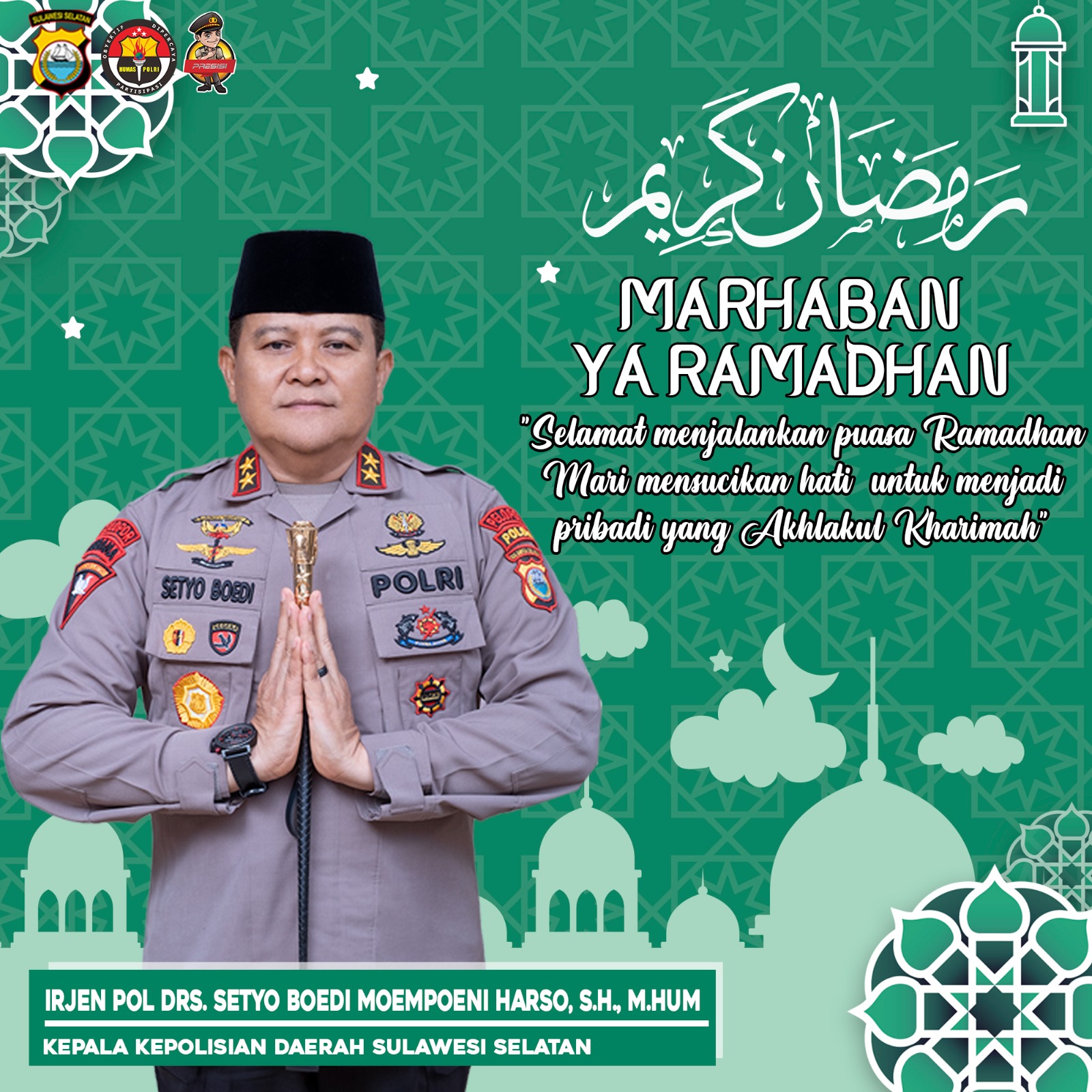 METROLUWURAYA.COM — Kapolda Sulsel, Irjen Pol Irjen Pol Setyo Budi Moempoeni., S.H.,M.Hum menyampaikan ucapan Selamat Menjalankan Ibadah Puasa Di bulan Ramadhan 1444 H kepada seluruh ummat Islam khususnya di Sulsel.