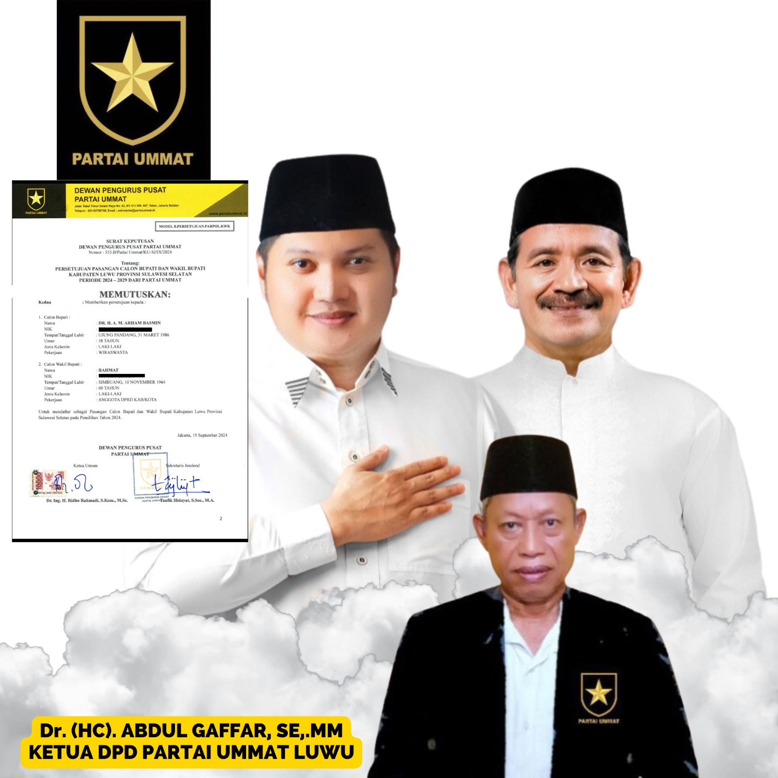 Ketua Partai Ummat Kabupaten Luwu, Abdul Gaffar mengatakan, dukungan partai Ummat kepada paslon bupati dan wakil bupati Luwu Arham Basmin Mattayang-Rahmat diambil berdasarkan hasil rapat dewan pengurus tingkat pusat.