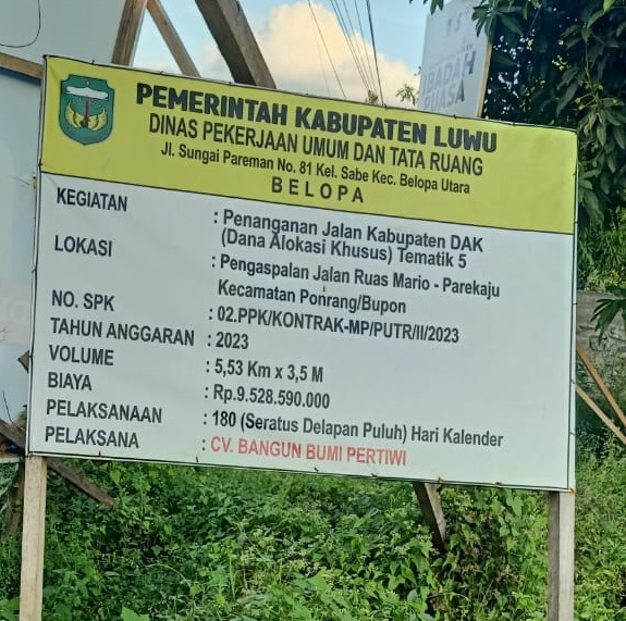 Salah satu ruas jalan yang telah rampung pengerjaannya pada tahun 2023 ini yakni Jalan Ruas Mario-Parekaju Kecamatan Ponrang Kabupaten Luwu, Dengan anggaran 9,5 Miliar Rupiah bersumber dari Dana Alokasi Khusus (DAK) tematik 5.