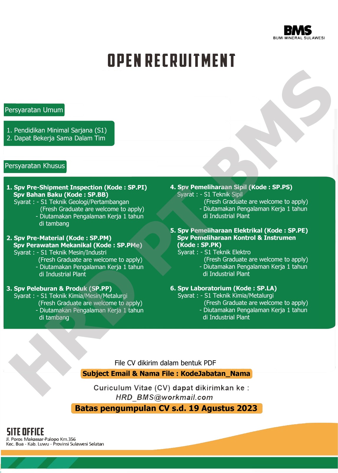 Adapun lowongan kerja yang dibuka PT BMS antara lain untuk posisi Spv Pre-Shipment Inspection, Spv Bahan Baku, Spv Pre-Material, Spv Perawatan Mekanikal, Spv Peleburan dan Produk, Spv Pemeliharaan Sipil, Spv Pemeliharaan Elektrikal, Spv Pemeliharaan Kontrol dan Instrumen, Spv Laboratorium.
